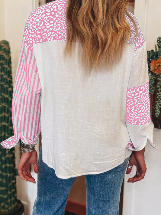 Waffle Knit Plaid Patchwork Long Sleeve Blouse